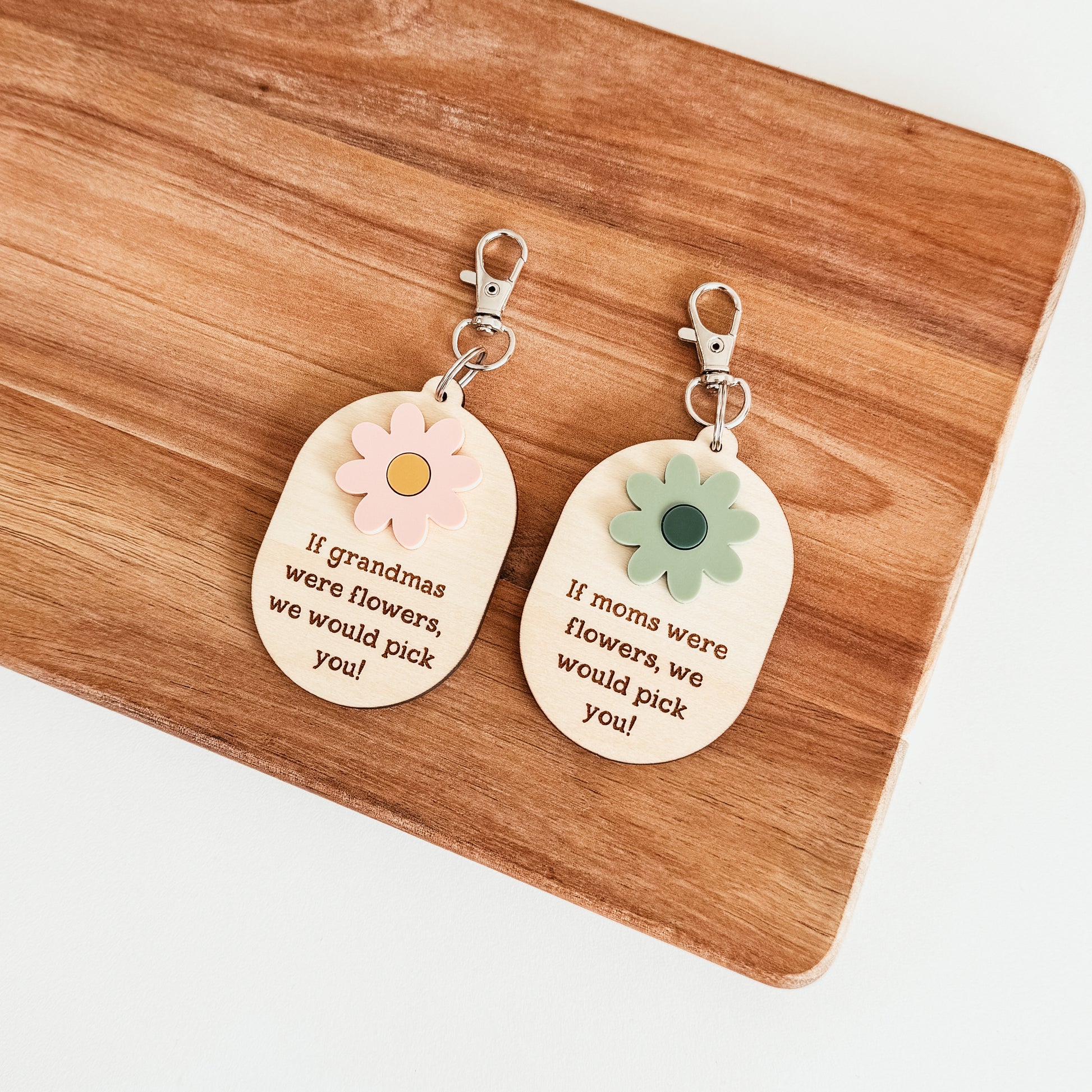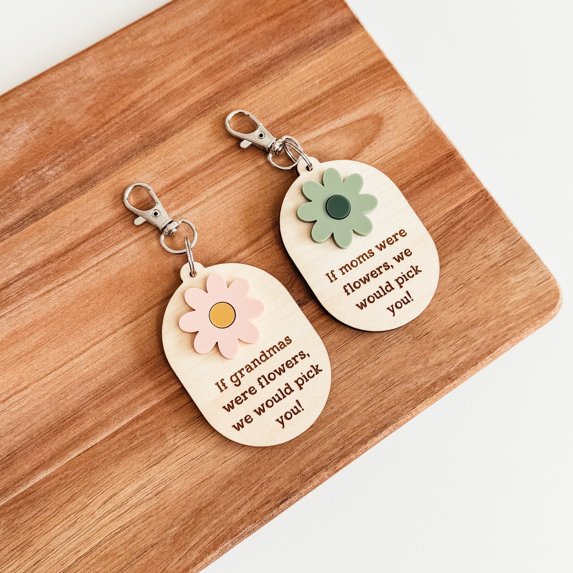 Our wooden keychains are cut from premium-grade, laminated maple wood and engraved with our studio laser for a permanent finish that will not fade or rub off. Finished with a 3D acrylic daisy.