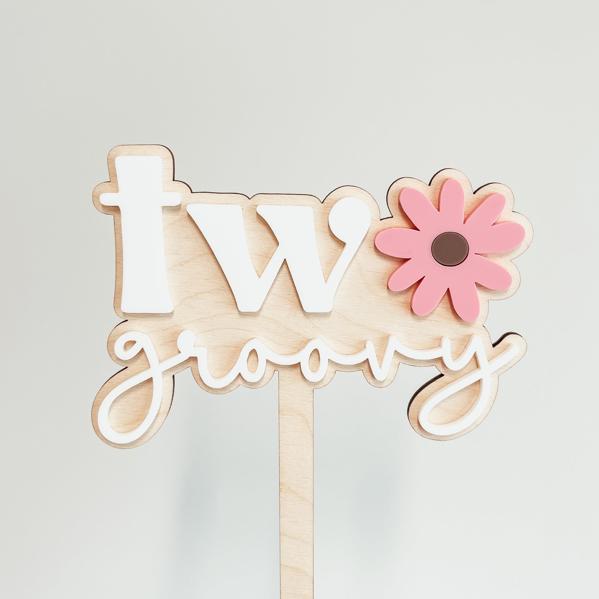 Each topper is constructed from two layers of wood and acrylic. The background is high-quality birch wood; the flower pieces and text are cut from coloured acrylic and permanently adhered for a 3D effect.